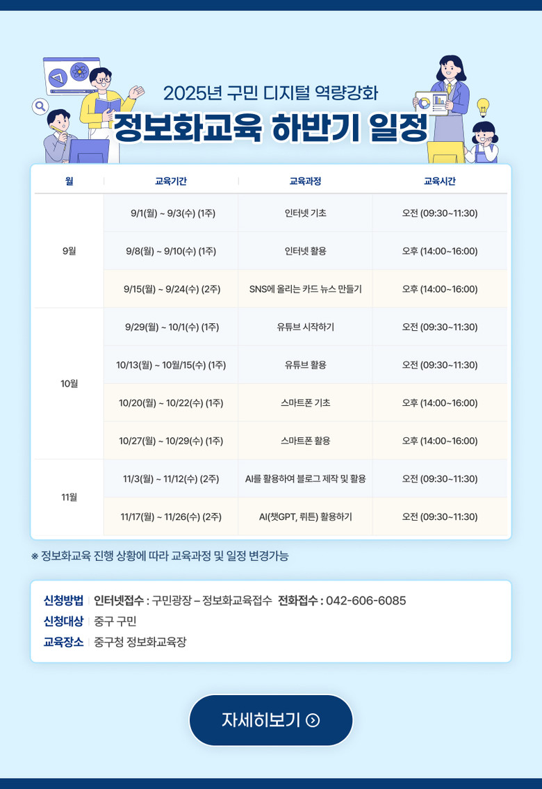 교육은 9월 1일부터 11월 26일까지 중구청 정보화교육장에서 무료로 진행되며, 중구 구민을 대상으로 교육과정별 선착순 20명을 모집한다.
