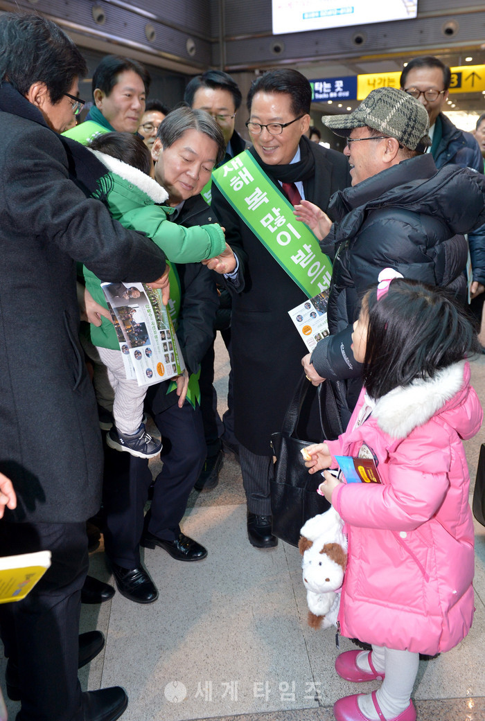 국민의당 박지원 대표와 안철수 전 대표를 비롯한 주요 당직자들이 26일 오후 서울 용산구 용산역에서 설 귀성 인사를 하고 있다. 2017.01.26.