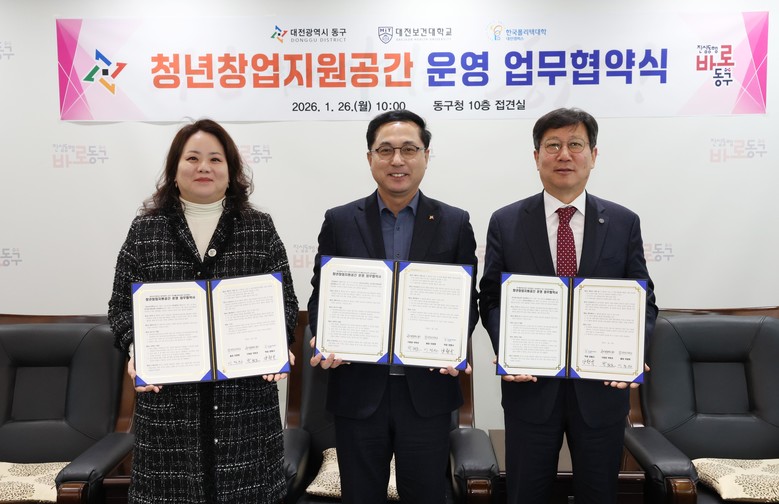 [동구 세계타임즈=이채봉 기자] 대전 동구(구청장 박희조)는 26일 대전보건대학교(총장 이정화)‧한국폴리텍Ⅳ대학 대전캠퍼스(학장 양형규)와 청년창업지원공간 운영을 위한 업무협약(MOU)을 체결했다고 밝혔다.