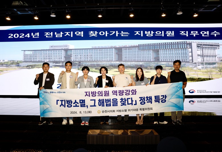 [순천시 세계타임즈=우덕현 기자] 순천시의회(의장 강형구) 지방소멸 위기대응 특별위원회(위원장 이복남)는 점차 현실화되고 있는 지방소멸 문제에 선제적으로 대응하고, 지역맞춤형 전략 개발을 위해 「전남지역 찾아가는 지방의원 직무연수, 지방소멸 정책특강」에 참석했다.