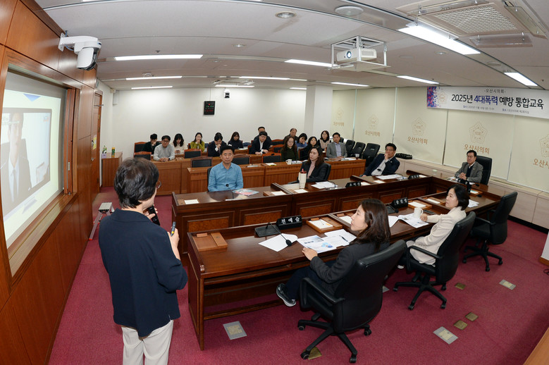 [오산시 세계타임즈=송민수 기자] 오산시의회(의장 이상복)는 14일 의회 제2회의실에서 의원과 의회사무과 직원을 대상으로 ‘4대 폭력(성희롱·성매매·성폭력·가정폭력) 통합 예방교육’을 실시했다.