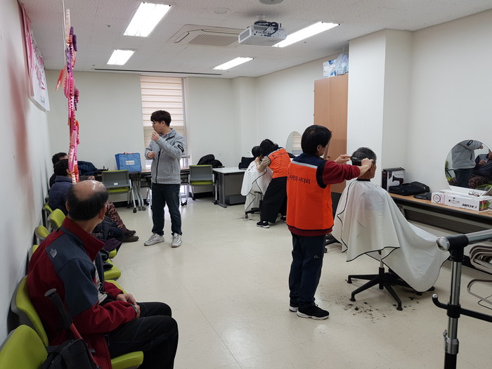 [세계타임즈 이장성 기자] 7천명 SNS 대전시 봉사단체 사랑의 사다리 밴드(리더 이정제)는 12일 오전10시, 대전시립손소리복지관(관장 유형걸) 4층에서 농아인들에게 미용봉사로 우리 사회의 따뜻한 사랑을 전달하였다.