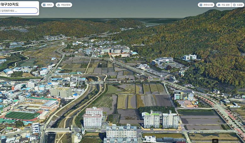 대구3D지도는 대구광역시의 지형과 건물을 3D지도로 구현하고, 그 위에 행정, 교통, 건설 등의 도시정보를 결합한 디지털 공간지도이다.