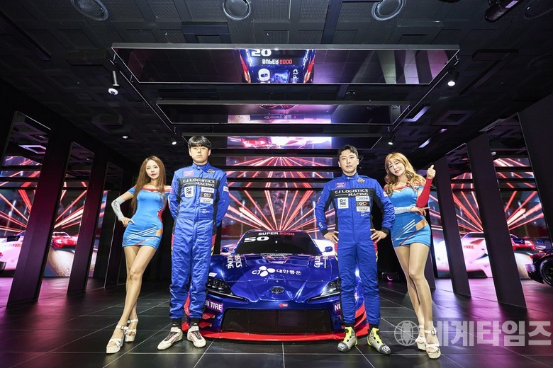 롯데월드타워 전망대 ‘서울스카이’ 전시존에 전시된 슈퍼 6000 클래스 레이싱카와 CJ로지스틱스 레이싱 박준서(왼쪽)와 오한솔.