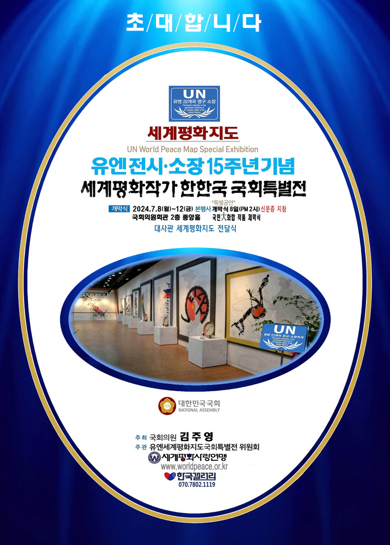 유엔(UN) 22개 국가 대표부 전시⋅소장작가로 국제적인 관심을 받고 있는 한한국 작가는 '세계평화지도 UN소장 15주년 기념 개인특별전' 에는 김주영 국회의원이 주최하고, 유엔세계평화지도국회특별전위원회와 세계평화사랑연맹(이사장 한한국), 한국갤러리가 주관한다.
