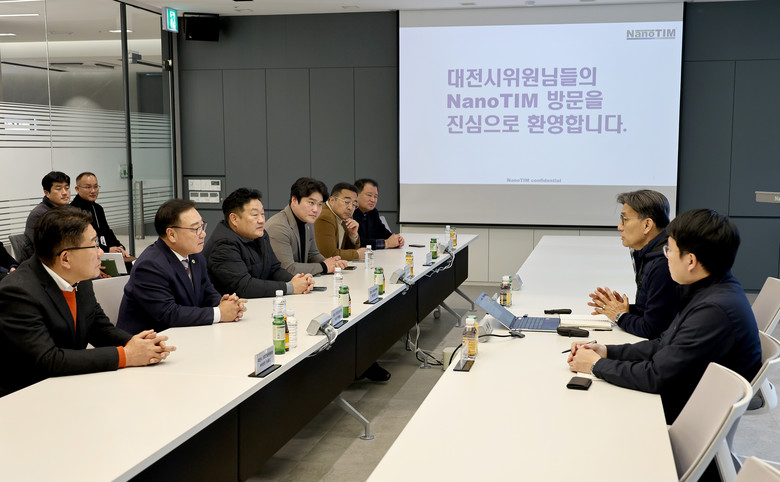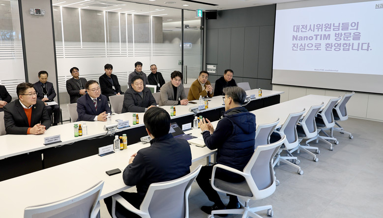 다음으로 방문한 곳은 대전시 신동 과학비즈니스벨트 지구에 위치한 나노팀으로 자동차용 열관리 소재 분야에서 독보적인 기술력으로 최근 글로벌 대기업과 납품 계약을 체결하는 등 지역 내 우수한 중견기업이다. 산업건설위원회는 애로사항을 청취하고 기업 운영에 적극적인 협조를 약속했다.