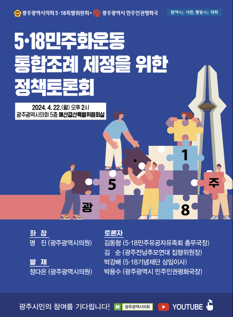 이런 가운데 열리는 이날 토론회는 ▲명진 5·18특별위원회 부위원장이 좌장을 맡고 ▲정다은 위원장이 발제자로 나서 조례 취지와 주요 내용 등을 설명한다.