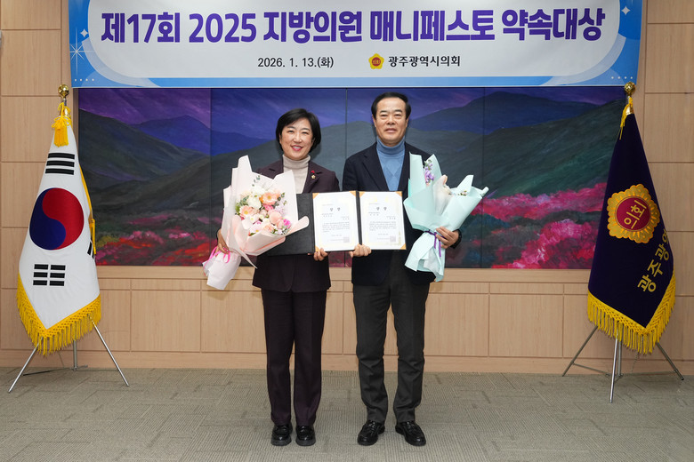 [광주 세계타임즈=손권일 기자] 광주광역시의회 신수정 의원이 “2025년 지방의원 매니페스토 약속대상” 좋은조례 분야에서 최우수상을 받았다.