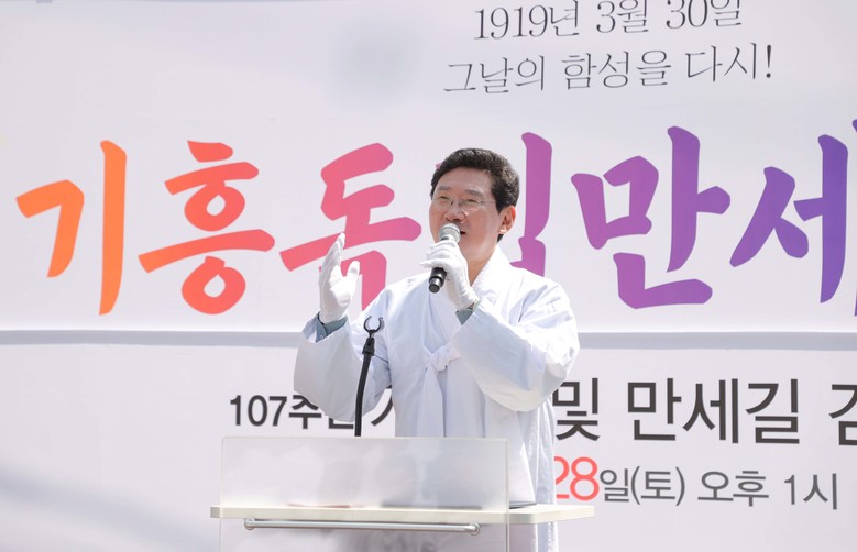 이 시장은 “107년 전 3월 29일 선열들이 독립과 자유를 쟁취하기 위해 모여서 대한독립만세를 외치며 우리 민족의 위대한 저력과 힘을 보였다”며 “오늘 행사로 우리가 107년 전 분연히 떨쳐 일어난 선열들의 행동을 기억하는 것은 다시는 그 누구도 빼앗지 못할 우리의 내일을 만들기 위해서라고 생각한다”고 말했다.