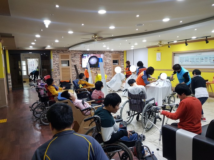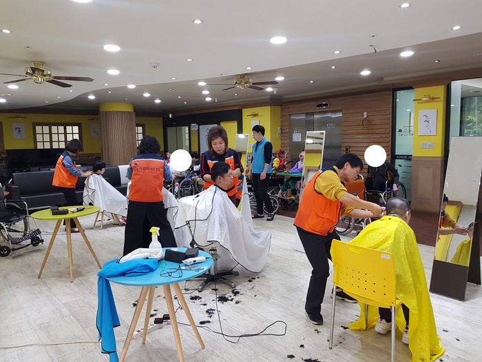 이날 미용봉사에는 송남석 단장을 비롯해서 이하영 조선옥 조은숙 가위천사들이 40명의 중증장애인들에게 미용봉사를 하였다.