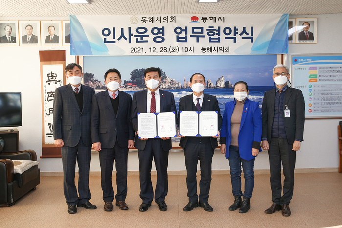[동해시=세계타임즈 김민석 기자] 동해시의회(의장 김기하)는 28일 오전 10시 동해시의회 의장실에서 내년 지방의회 인사권 독립에 따른 원만한 인사 운영을 위해 동해시(시장 심규언)와 업무협약식을 가졌다.