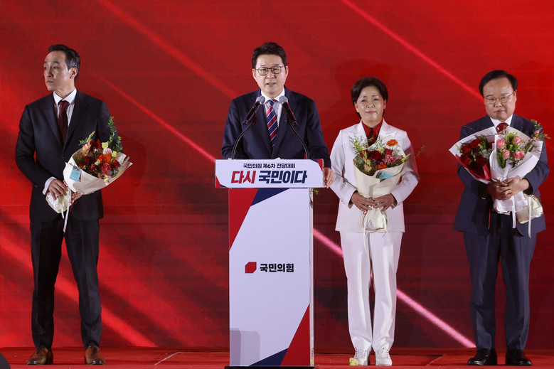 [세계타임즈 = 신상철 기자] 22일 충북 청주시 흥덕구 청주오스코에서 열린 국민의힘 제6차 전당대회에서 최고위원에 당선된 신동욱후보가 수락 연설을 하고 있다. 2025.8.22