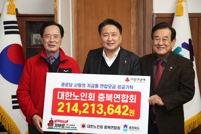 [충북 세계타임즈=이현진 기자] (사)대한노인회충북연합회(회장 이명식)는 6일 김영환 지사, 이민성 충북사회복지공동모금회장이 참석한 가운데, 충북지역의 경로당 4,102개소에서 사랑의 저금통을 통해 모금한 성금 214백여만 원을 기탁했다.