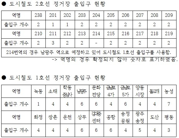 한편, 도시철도 2호선 1단계 구간은 모두 20개 역사를 계획중이며 가칭 201번역인 시청 앞과 가칭 202번역인 상무지구 BYC 건물 인근의 역사는 출입구를 단 한곳만 설치할 계획을 세우고 있는 등 37개 출입구에 불과하다.