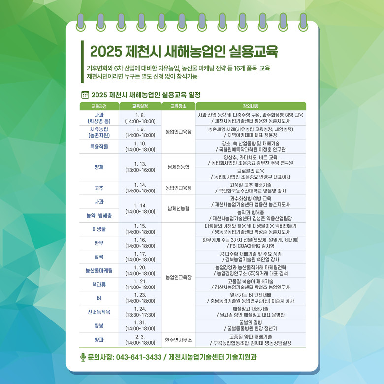 주요 교육내용은 품목별 교육과 현장에서 발생하는 어려움을 해결하는데 주안점을 두고 요즘 대두되고 있는 기후문제와 6차산업에 대비한 치유농업, 농산물 마케팅 전략, 신소득작목 등 16개 품목에 대한 핵심 영농기술을 다루며 제천시농업기술센터, 남제천농협, 한수면행정복지센터에서 진행된다.