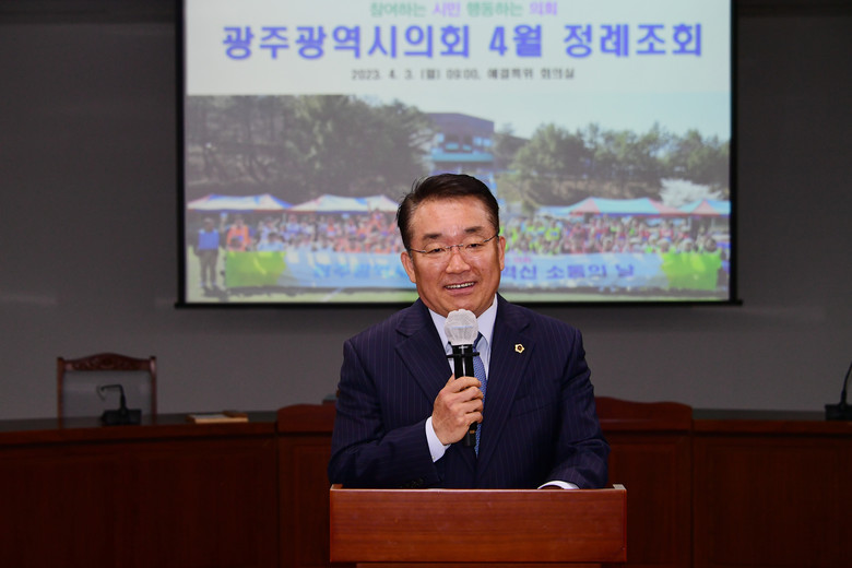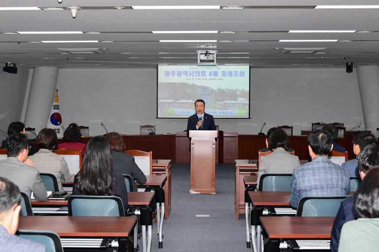 [광주 세계타임즈=손권일 기자] 광주광역시의회(의장 정무창)는 3일 의원과 사무처 직원 등 100여 명이 참석한 가운데 광주시의회 4월 정례조회를 개최했다.
