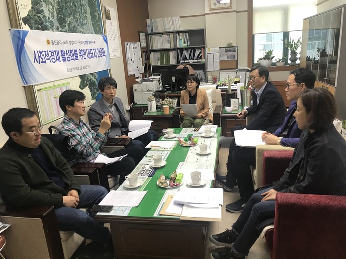 [울산=세계타임즈 이호근 기자] 울산시의회 김미형 행정자치위원은 28일 15시부터 시의회 2층 의원연구실에서 울산광역시교육청 서진규 정무특보, 사회적기업 나비문고 대표 이영도, 사회적협동조합 세차장 대표 이광열, 남구친환경급식센터 권병규, 예비사회적기업 나인도어스 대표 이승근, 코끼리공장 대표 이채진 등 관계자 6명과 사회적경제 활성화를 위한 4회차 대표자 연구모임을 개최했다.