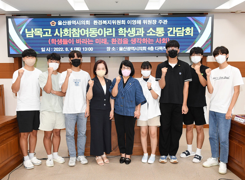 간담회는 이영해 환경복지위원장과 손명희 의원을 비롯해 남목고등학교 사회참여동아리 ‘다원’(대표 정윤서) 회원 10여명이 참석하여 ‘학생들이 바라는 미래, 환경을 생각하는 사회’에 대한 의견을 제안하기 개최되었다.