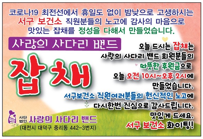 서구보건소 김은희 감염병관리팀장은 “오늘 사랑의 사다리 밴드 봉사단체에서 잡채를 간식으로 지원해 주어서 큰 힘과 위안이 된다.”면서 “서구보건소는 코로나19가 하루속히 종식될 수 있도록 최선의 노력을 다하겠다.‘면서 감사함을 전했다.