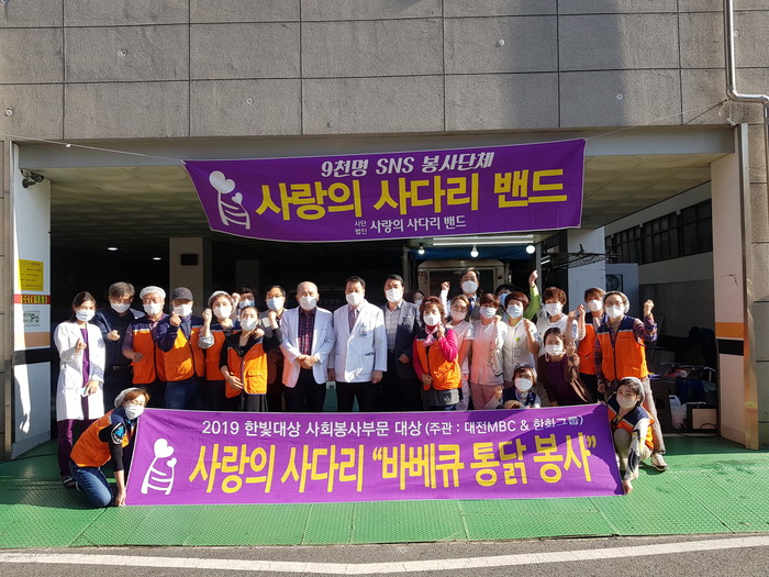 [대전=세계타임즈 이채봉 기자] 9천명 SNS 대전시 봉사단체 사랑의 사다리 밴드(리더 이정제)는 20일 오후3시, 중구 선화동 세명요양병원(이사장 김석희)에서 200분의 어르신들에게 바비큐 통닭 100마리 봉사로 사회적 효행을 실천하였다.