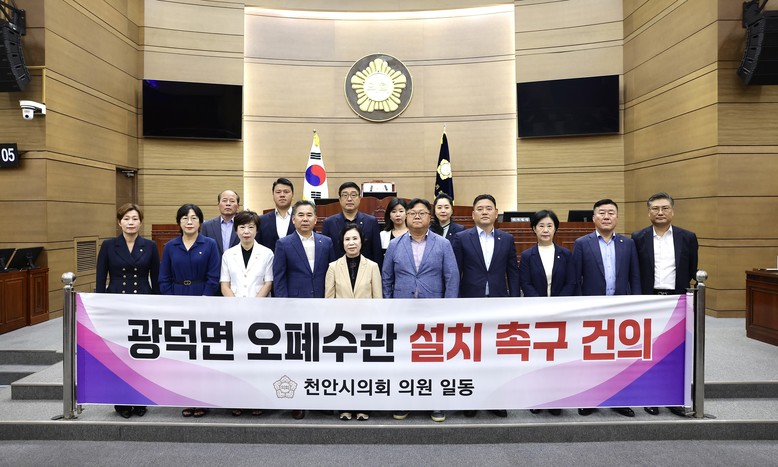 [천안시 세계타임즈=백택기 기자] 천안시의회는 2024년 9월 6일 열린 제272회 임시회에서 박종갑·김영한 의원이 발의한 '광덕면 오·폐수관로 설치 촉구 건의안'을 만장일치로 채택했다. 이번 건의안은 광덕면의 오·폐수 처리시설 부재로 인해 주민 건강과 자연환경이 심각한 위협을 받고 있다는 문제를 해결하기 위해 발의되었다.
