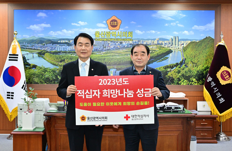 [울산 세계타임즈=이호근 기자] 울산광역시의회 김기환 의장은 1일 오후 4시, 의장실에서 김철 대한적십자사 울산지사 회장, 정민혜 부회장 등이 참석한 가운데 울산지사에 ‘2023년도 울산시의회 적십자 특별회비’ 전달식을 개최했다.