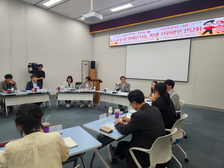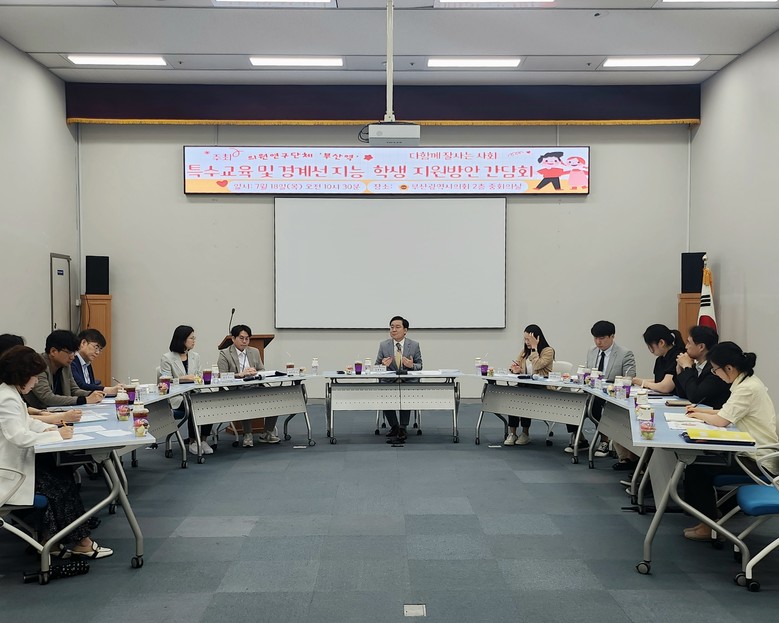 [부산 세계타임즈=이용우 기자] 부산시의회 의원연구단체 ‘부산역’이 아동발달 관점에서 특별한 지원을 필요로 하는 장애아동과 경계선지능학생의 행복한 교육환경 마련에 나섰다. ‘부산역’(부산 시민이 행복할 수 있도록 역할을 하는 모임) 소속 의원은 18일, 시의회 중회의실에서 ‘특수교육 및 경계선 지능 학생 지원방안’ 정책간담회를 개최했다. 이 자리에는 장애아동 및 경계선지능아동 학부모 대표와 김미화 연제구의회 의원, 배화학교 김경애 교감 및 부산시교육청 소관부서 담당자 등이 참석했다.