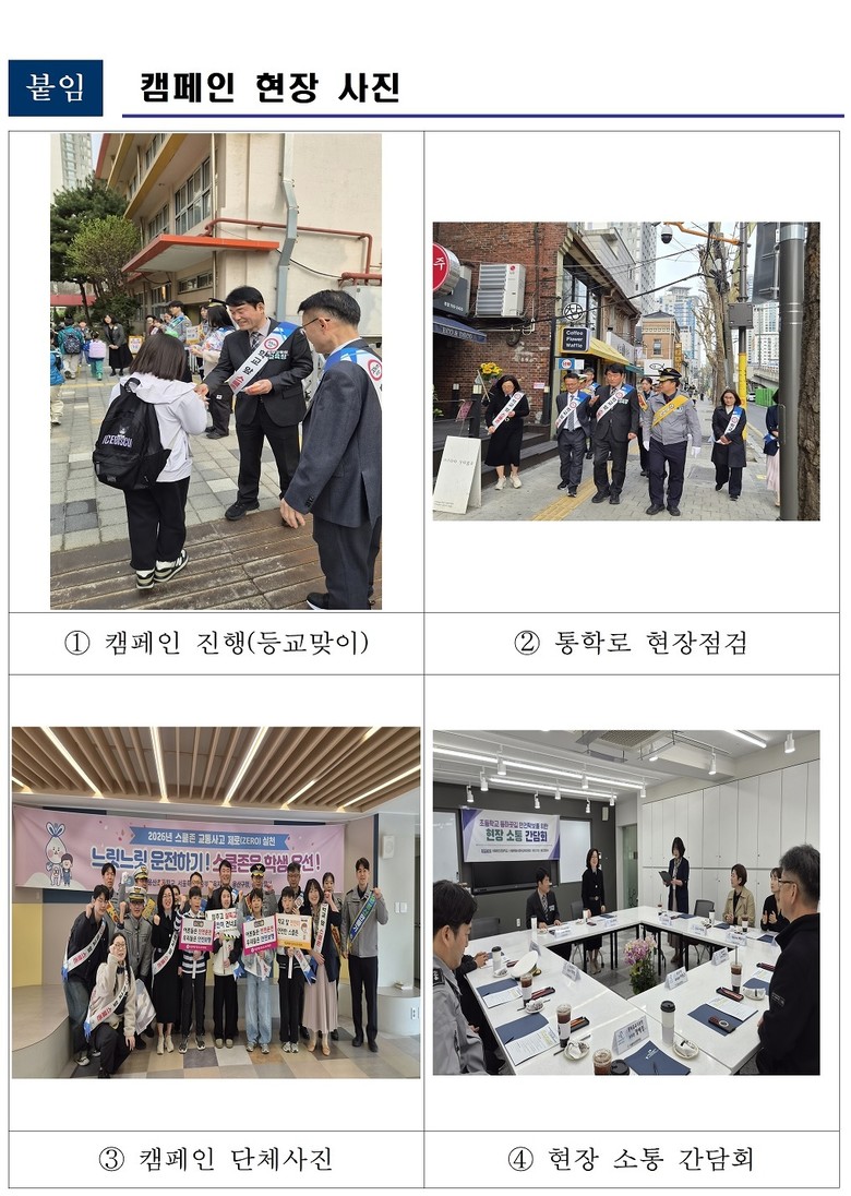아울러, 이번 캠페인에서는 학교 주변 학생들의 주통학로를 유관기관과 합동으로 점검하여, 횡단보도, 신호등, CCTV 등 위험 요소를 파악하고, 특히 통학로 인근(삼각지역) 공사 진행에 따라 발생할 수 있는 위험요인에 대해 현장을 확인하고 이후 현장 소통 간담회를 통해 현장에 적합한 교통시설 개선 방안을 논의하였다.