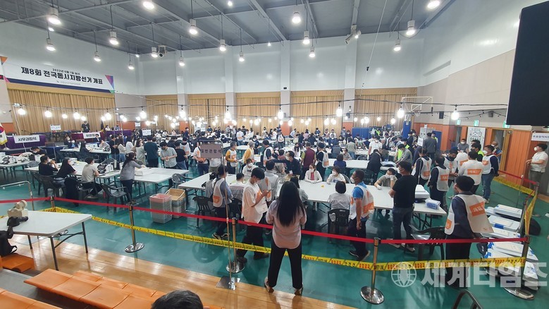[세계타임즈 = 이판석 기자] 제8회 전국동시지방선거일인 1일 오후 경남 의령군 종합사회복지관에 마련된 개표소에서 개표 작업이 진행되고 있다.