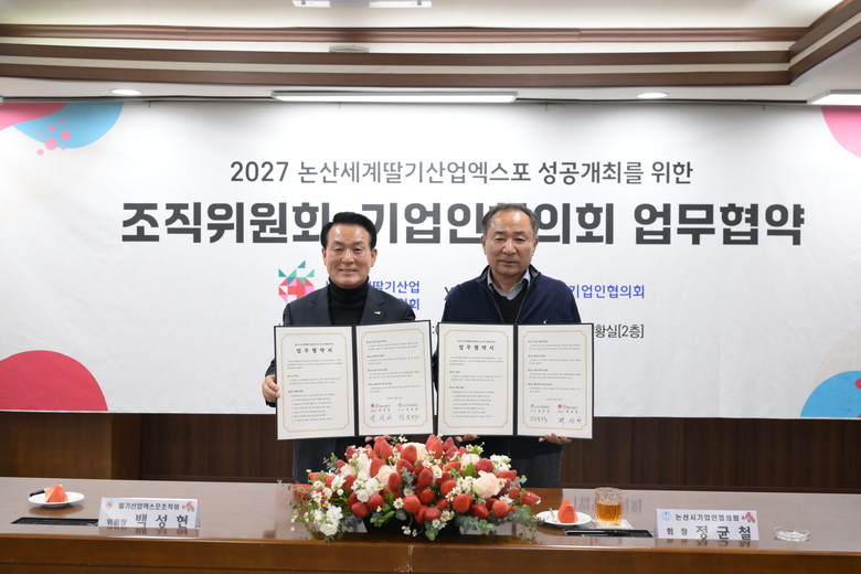 26일 (재)논산세계딸기산업엑스포조직위원회(공동위원장 백성현)는 논산시기업인협의회(회장 정균철)와 업무협약을 체결했다.