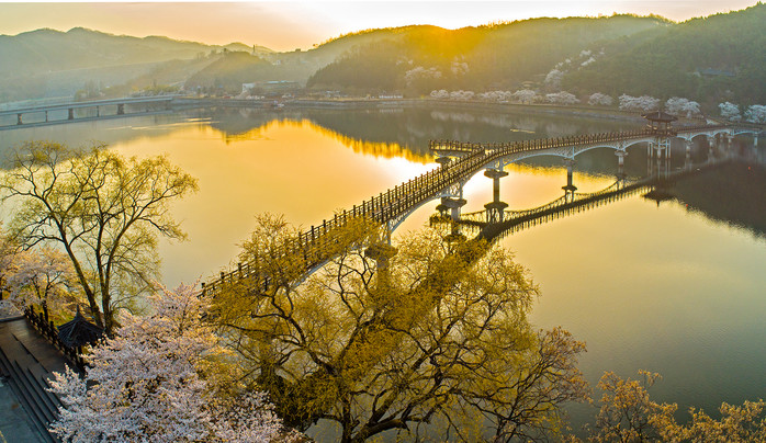 안동댐 보조호수를 가로 지르는 목책교와 만개한 벚꽃, 한창 물오르기 시작한 연두빛의 왕버들이 어우러져 산뜻한 봄의 아름다움을 선사하고 있다.