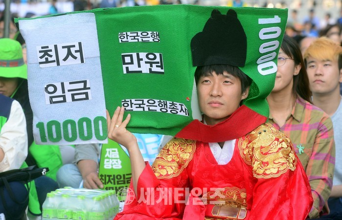 27일 오후 서울 종로구 청계광장에서 열린 ‘지금 당장’ 촛불행동 집회에서 최저임금만원비정규직철폐공동행동 회원이 임금옷을 입고 ‘최저임금 만원’을 촉구하고 있다. 2017.05.27.