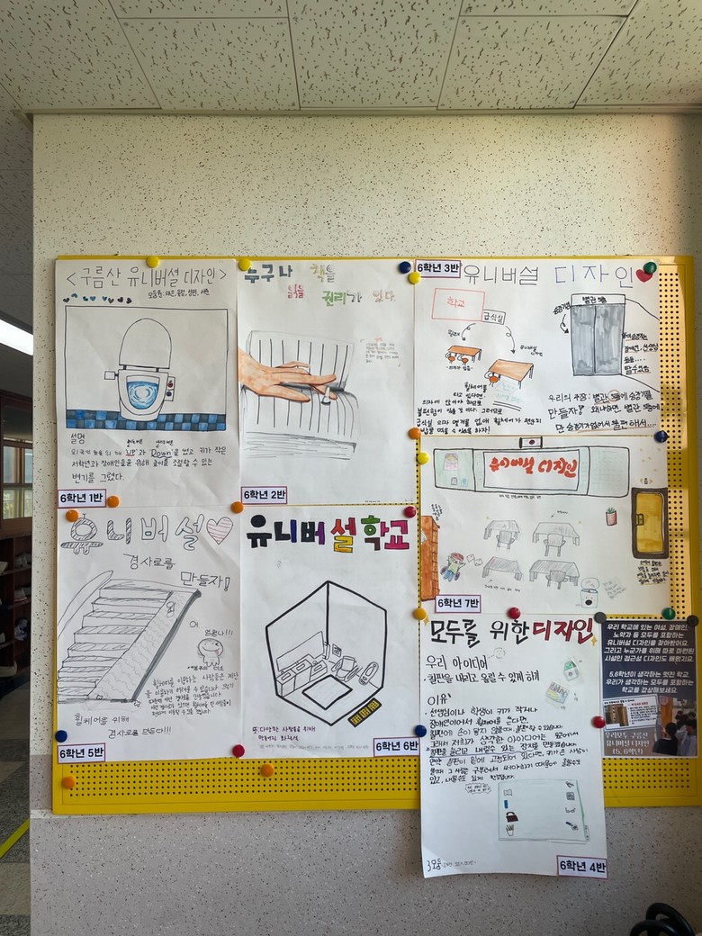 - 5,6학년은 ‘유니버설 디자인 만들기’를 통해 교내의 유니버설 디자인에 대해 알아보고, 유니버설 디자인 및 접근성 디자인을 포함한 학교를 디자인했다.