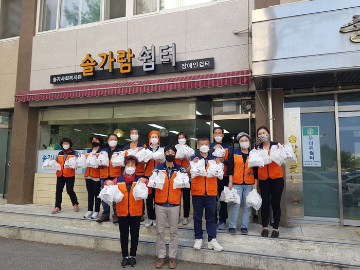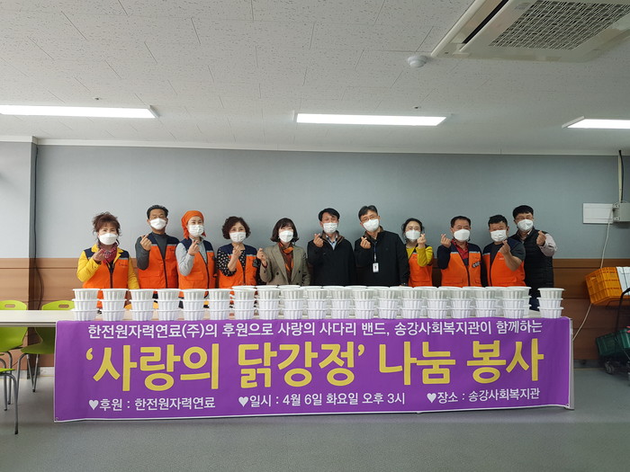 송강사회복지관 김영미 관장은 “오늘 ㈜한전원자력연료와 사랑의 사다리 밴드 봉사단체에서 닭강정을 지원해 주어서 큰 힘과 위안이 된다.”면서 감사함을 전했다.