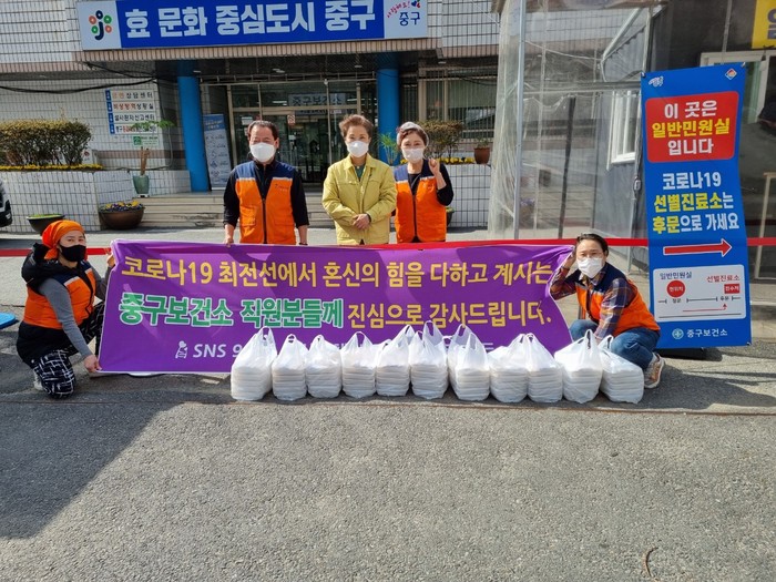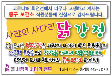 중구보건소 구기회 소장은 “오늘 사랑의 사다리 밴드 봉사단체에서 맛있는 닭강정을 지원해 주어서 큰 힘과 위안이 된다,”면서 “중구보건소는 코로나19가 하루속히 종식될 수 있도록 최선의 노력을 다하겠다.”고 말했다.