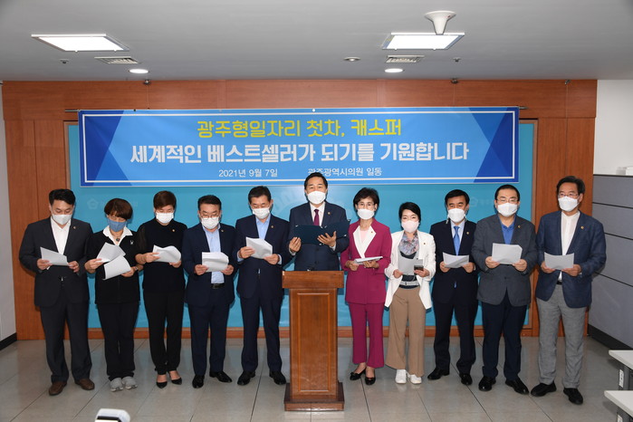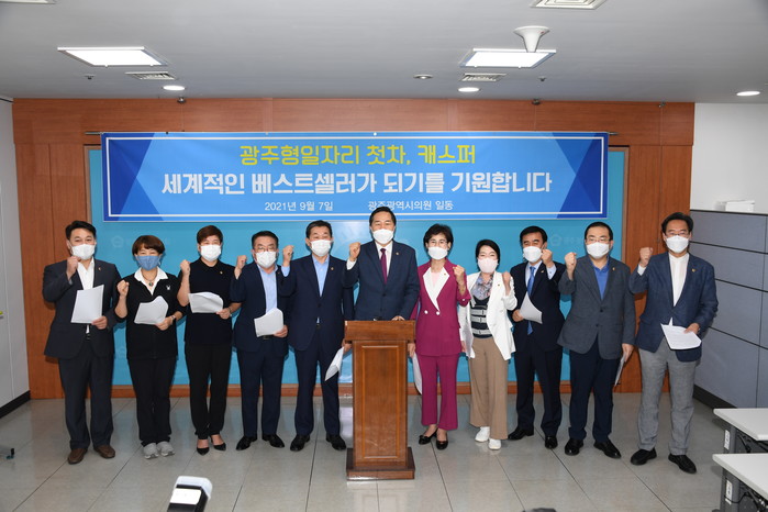 [광주=세계타임즈 손권일 기자] 광주광역시의회(의장 김용집) 의원들이 7일 오후 시의회 기자실에서 '광주글로벌모터스' 1호차 '캐스퍼'에 대한 관심을 촉구하는 호소문을 발표했다.