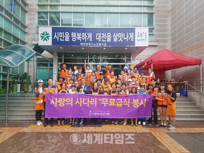 [대전=세계타임즈 이장성 기자] 5천명의 회원들이 활동하는 자발적인 SNS봉사 밴드인 사랑의 사다리 밴드(리더 이정제)는 14일 오전 9시부터 대전광역시 노인복지관(관장 유한봉)에서 점심 급식시간에 500분의 어르신들께 즉석 빵, 부침개, 커피 600개를 전달을 하면서 이웃사랑을 전했다.
