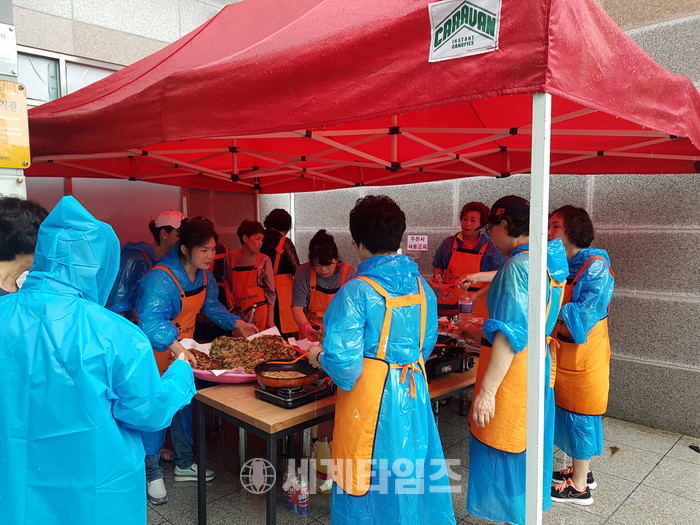 이날 봉사에는 유희자 나눔봉사단장을 비롯하여 50명의 회원들이 비오는 날씨에도 우비를 입고 즉석 빵, 부침개, 커피를 600개를 만들어서 사회적 효행을 실천하는 봉사를 하였다.