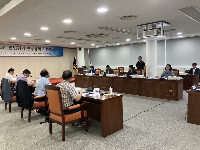 [전남 세계타임즈=우덕현 기자] 전라남도의회(의장 서동욱)는 23일 도의회 초의실에서 ‘전라남도 조례 입법평가 연구용역’ 최종보고회를 개최하여 그 간의 연구결과를 심의하였다고 밝혔다.