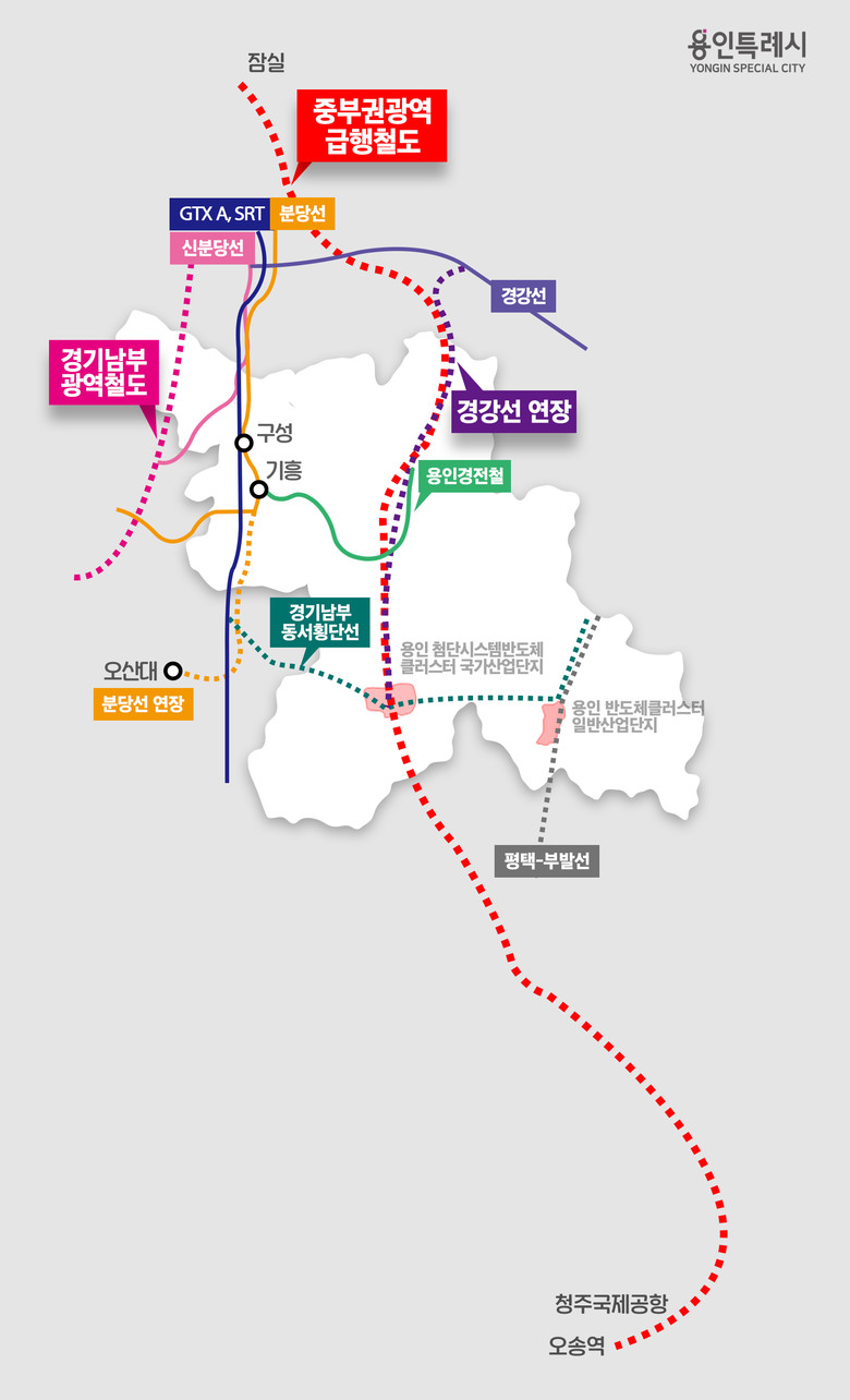 용인특례시에서는 처인구 모현·포곡읍, 시청 주변, 이동·남사읍에 조성 중인 ‘용인 첨단시스템반도체 클러스터 국가산업단지’를 통과해 청주공항과 KTX와 SRT가 정차하는 오송역을 연결하는 노선을 구상하고 있다. 이 철도노선이 용인 경전철 중앙시장역과 연결될 경우 이곳에서 잠실과 청주공항, 오송역까지 각각 30분대에 진입할 수 있게 된다.