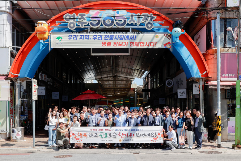 [경북 세계타임즈=한윤석 기자] 경상북도의회(의장 박성만)는 9월 10일(화) 추석명절을 맞아 박성만 의장, 임병하 도의원과 의회사무처 직원 60여명이 참여한 가운데 영주시 365시장을 방문해 전통시장 장보기 행사했다.