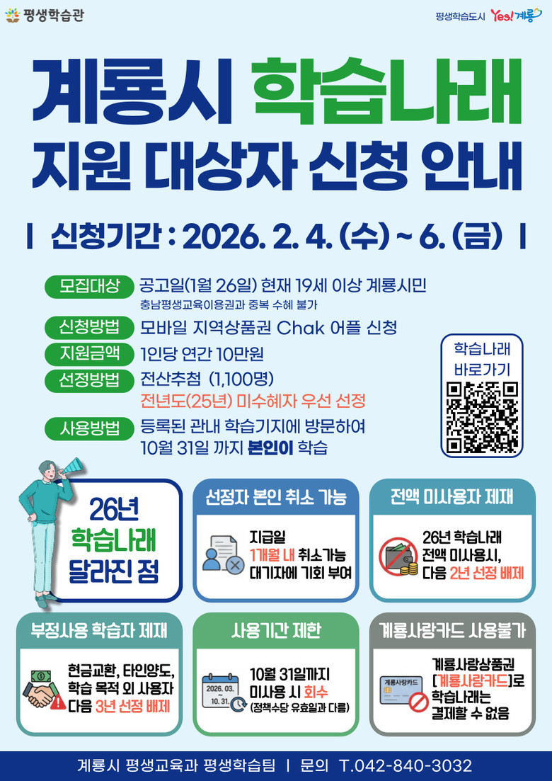 올해 학습나래 사업은 공고일(1월 26일) 현재 19세 이상 계룡시민을 대상으로, 1인당 연간 10만 원의 평생학습 지원금을 총 1,100명에게 지급해 시민들의 자기계발과 역량 강화를 지원할 예정이다.