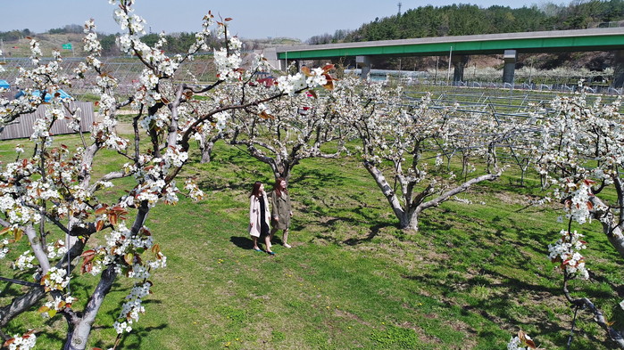 100살을 훌쩍 넘긴 배나무 20그루가 올해도 어김없이 하얀 배꽃을 활짝 피우며 오고 가는 이들의 발길을 붙잡고 있다.