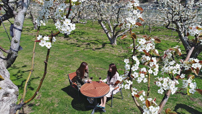 충북 영동군 과일나라테마공원의 봄햇살 가득담긴 배꽃이 순백의 우아한 자태를 뽐내며 상춘객들을 유혹하고 있다.