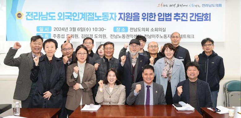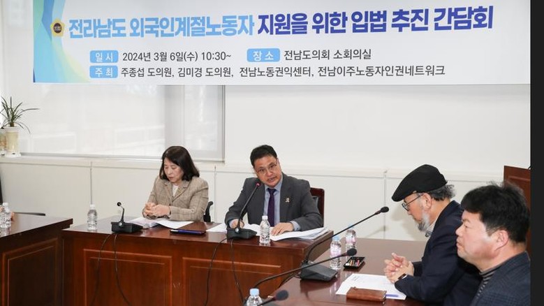 [전남 세계타임즈=우덕현 기자] 전라남도의회 주종섭 의원(더불어민주당, 여수6)은 지난 3월 6일 전라남도의회 소회의실에서 김미경 의원, 전남노동권익센터, 전남이주노동인권네트워크와 함께 공동으로 ‘전라남도 외국인계절노동자 지원을 위한 입법 추진 간담회’를 개최했다.