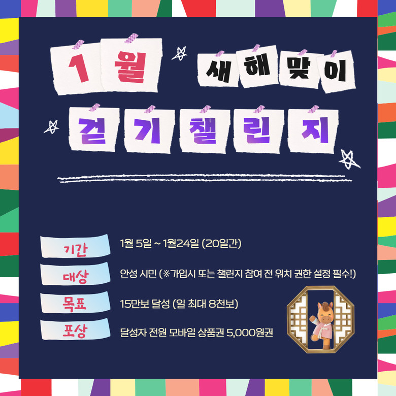 걷기챌린지는 공간과 인원 제약이 없는 건강증진 사업으로 걷기 앱 ‘워크온’을 통해 운영한다. 1월 걷기챌린지는 안성시민을 대상으로 1월 5일부터 24일까지 20일간 15만보 달성(1일 최대 8천보 인정)을 목표로 진행되며 목표를 달성한 참가자 전원에게 모바일 상품권 5,000원권을 증정한다.