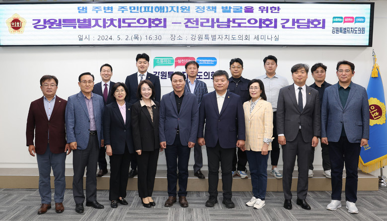 [강원도 세계타임즈=김민석 기자] 강원특별자치도의회 소양강댐 주변지역 피해지원 연구회(회장 박기영의원, 간사 양숙희의원)는 5월 2일 오후4시경 도의회 세미나실에서 전남도의회「댐환경특별위원회」(위원장 정영균의원)와 간담회를 개최하였다.