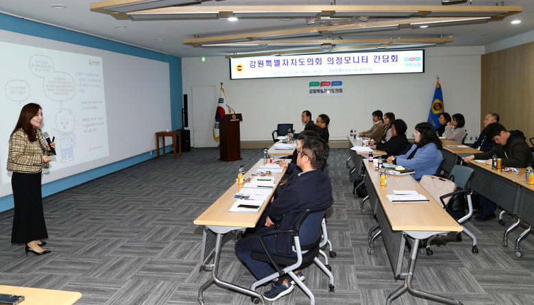 [강원도 세계타임즈=김민석 기자] 강원특별자치도의회는 12월 12일 ‘강원특별자치도의회 의정모니터 간담회’를 개최하여, 우수 의정모니터에게 표창장을 수여하고, 운영 개선점 논의 및 역량강화 교육을 진행했다.
