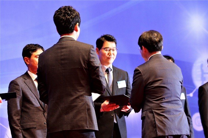 이정윤 시소플랫폼 대표가 16일 서울 코엑스에서 열린 국가생산성대회에서 4차 산업혁명 선도기업부문에서 성윤모 장관상 표창을 수상받고 있다.