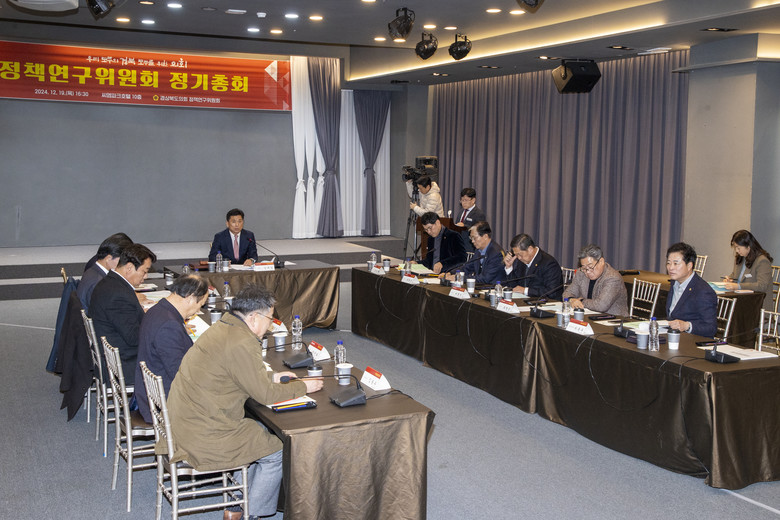 [경북 세계타임즈=한윤석 기자] 경상북도의회 정책연구위원회(위원장 김대일 의원)는 12월 19일(목) 안동 씨엠파크호텔에서 이춘우 경상북도의회 운영위원장, 정책연구위원회 위원, 의원연구단체 대표의원, 관계 공무원 등 40여명이 참석한 가운데 2024년도 정기총회를 개최했다. 이번 총회에서는 2025년도 정책연구위원회 예산집행계획과 함께 연구활동을 펼쳐 나갈 5개 연구단체의 연구활동계획을 심의했다.